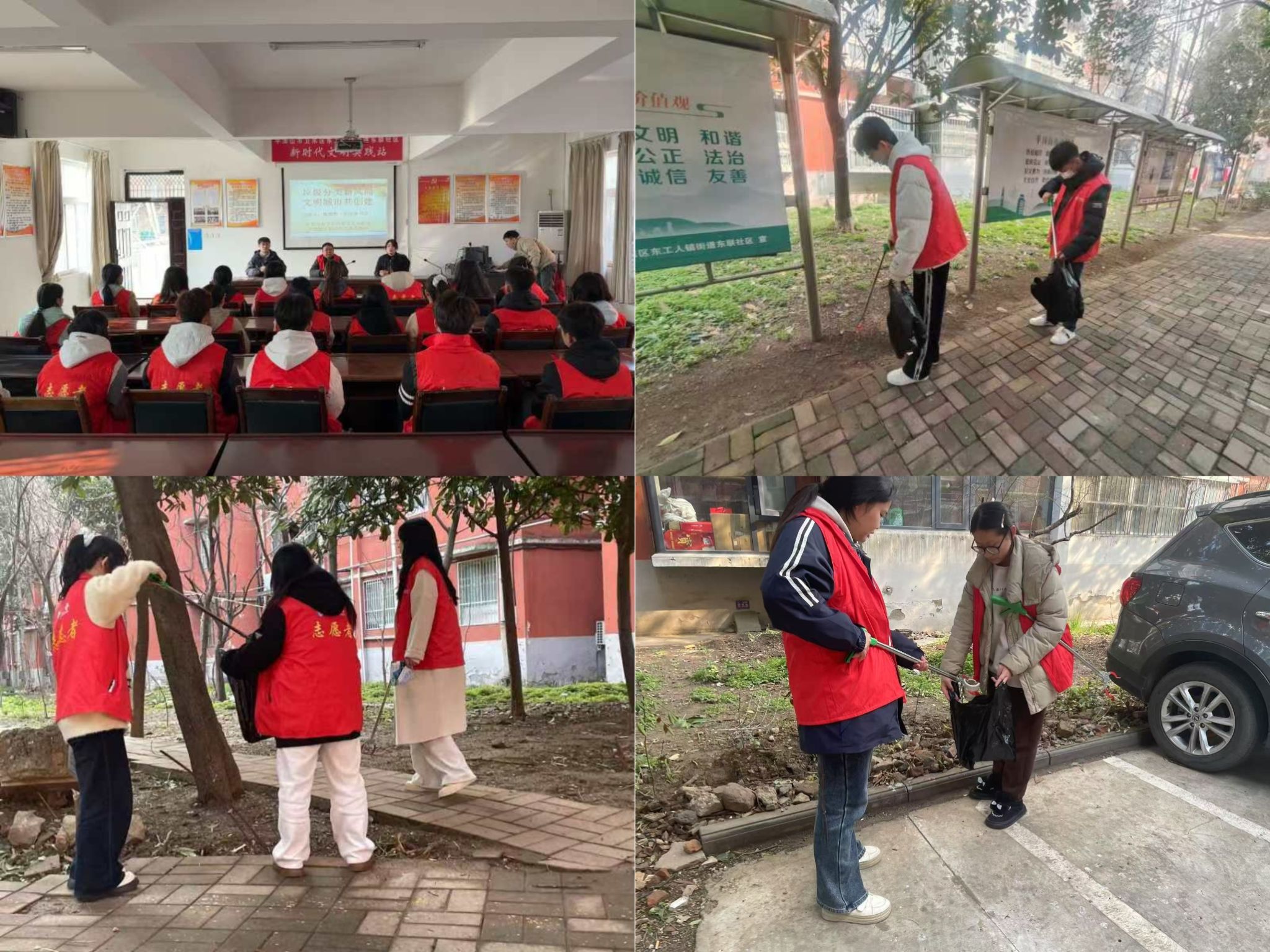 全体志愿者手持扫帚、垃圾袋等工具,对校园卫生死角进行了清扫,捡拾了垃圾和树枝,为营造整洁优美的校园环境贡献了自己的力量。