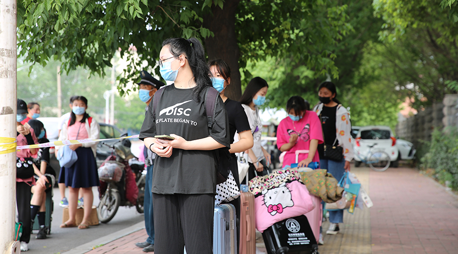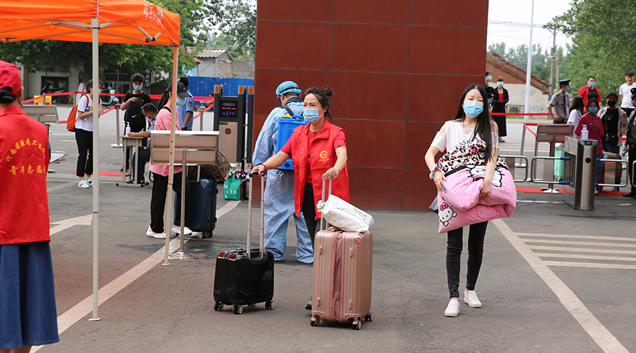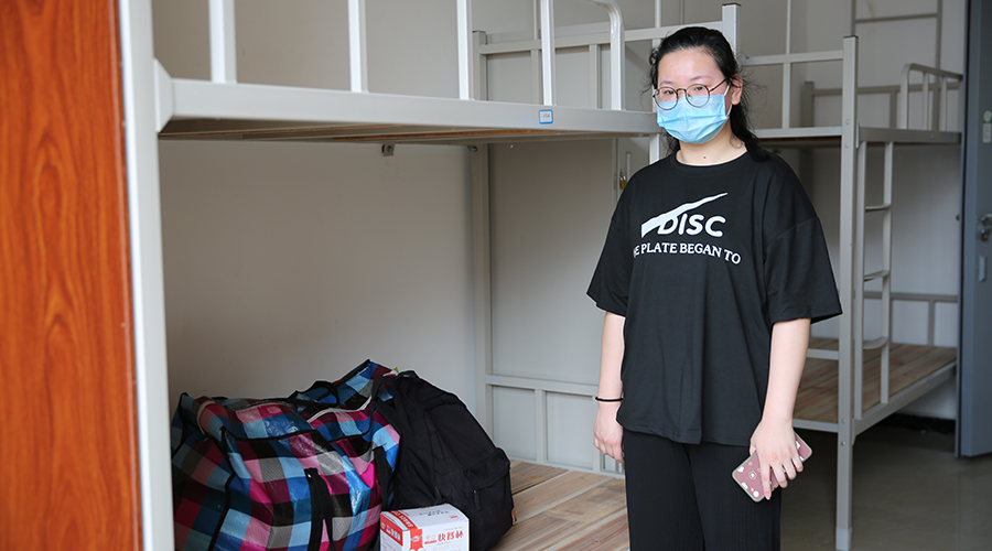 第一批进入校园的同学们,在志愿者老师的引导和帮助下,依次进入宿舍楼,整理内务。