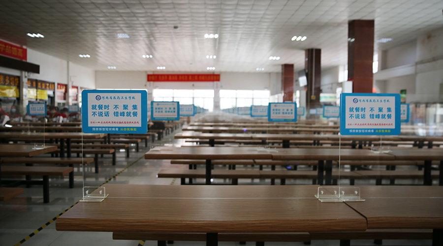 餐厅使用透明亚克力板进行中间隔断,师生就餐实施“交叉”间隔1米就座