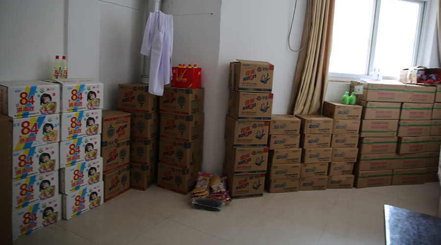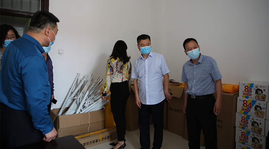 在防控物资储存室,督导组仔细查看各种防护物资的储备情况,对一次性医用口罩、额温枪、84消毒液、消毒酒精、医用防护服等重要物资进行认真查验。
