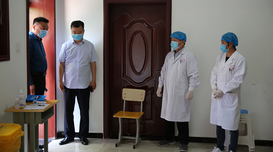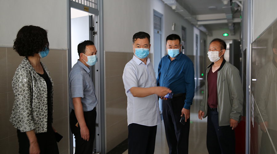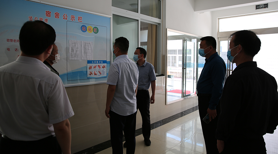 郭志勇一行首先实地查看了返校学生入校流程、校门口入校检查区、学校医务室、临时隔离观察区、防疫物资储存室、教室、学生宿舍、食堂等。随后,督导组听取了李进旭校长有关开学准备情况汇报。