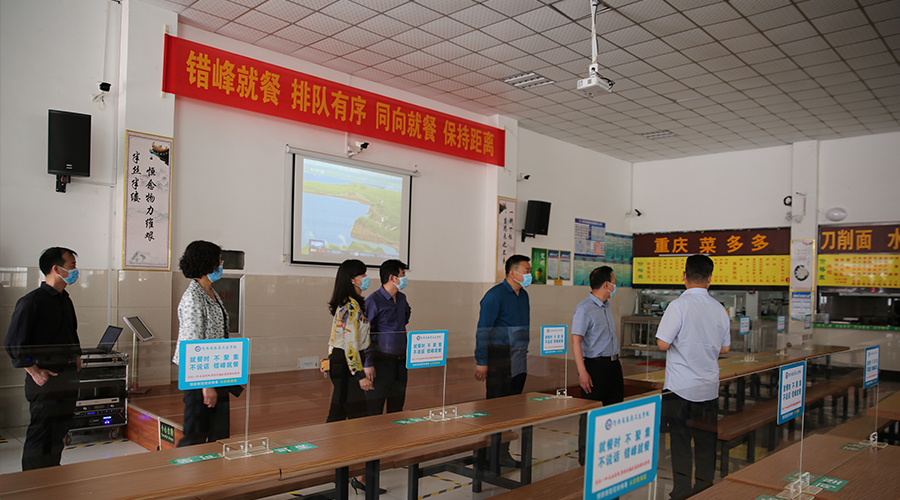 在学生食堂,督导组查看了入门洗手设施、体温检测点、地面排队标识、就餐位置、排队取餐、食品卫生等。