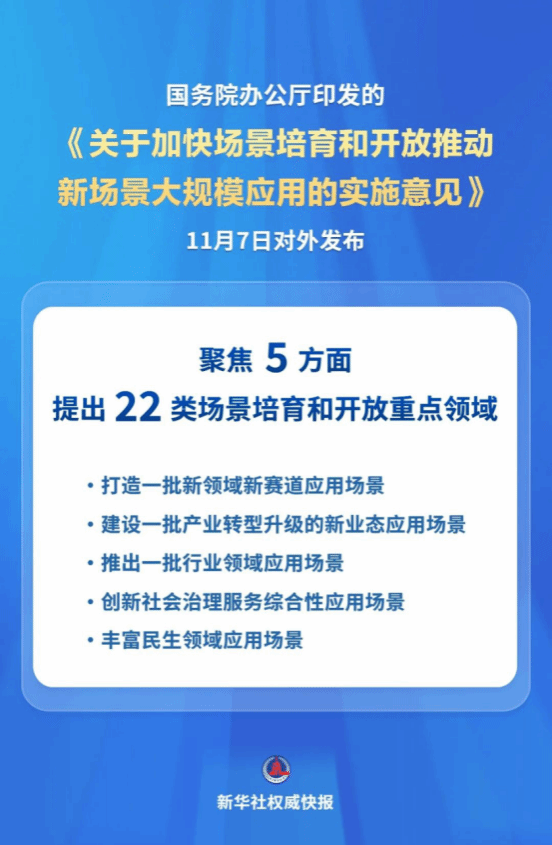 11月7日,国务院办公厅印发的《关于加快场景培育和开放推动新场景大规模应用的实施意见》对外发布。