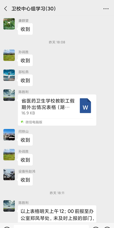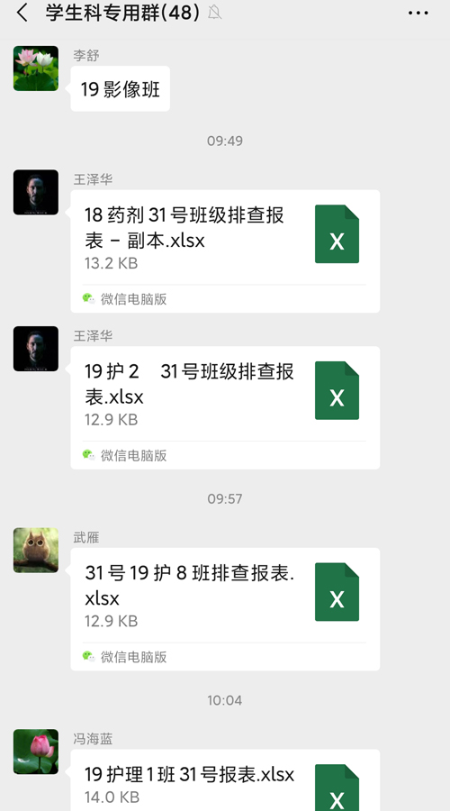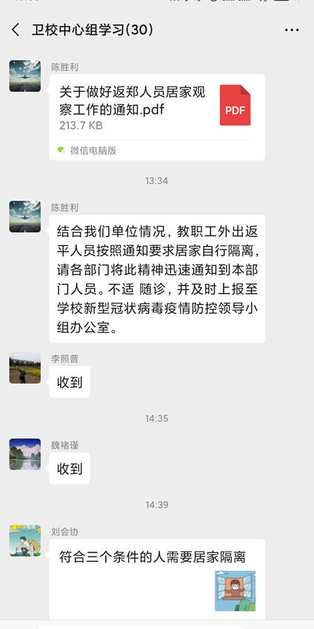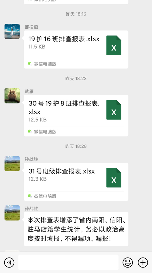 在做好宣传教育的同时,认真做好疫情排查工作。1月30日,根据省工信厅要求,学校扩大排查范围,在原有基础上,增加了对南阳、信阳、驻马店籍师生的登记筛查汇总工作,对排查出的重点人员,做到心中有数、全面掌控,坚持疫情日报告、零报告制度,为疫情防控提供详实准确的数据,有效防控疫情扩散和蔓延。