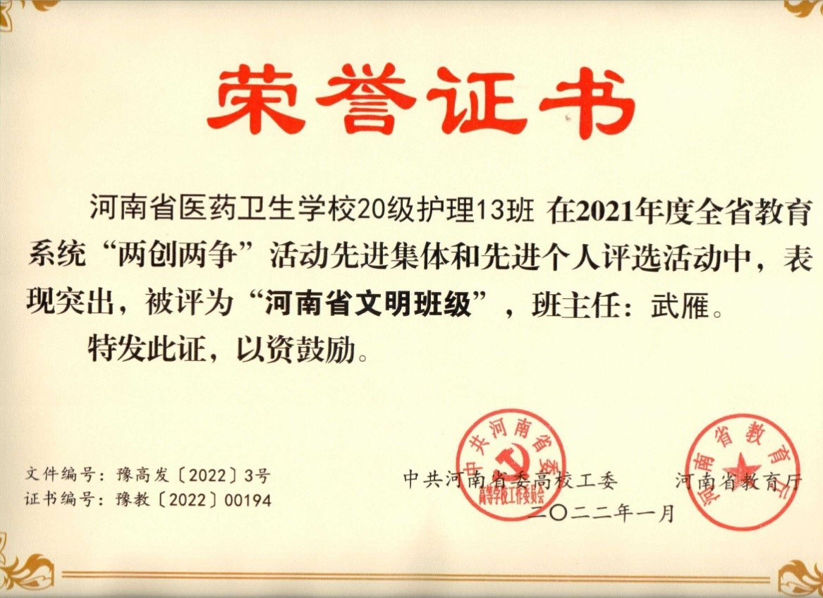 喜 报 近日,从中共河南省委高校工委、河南省教育厅传来喜讯。在其公布的《关于公布2021年度全省教育系统“两创两争”活动先进集体和先进个人评选结果的通知》豫高发〔2022〕3 号中,我校20级护理13班荣获“文明...