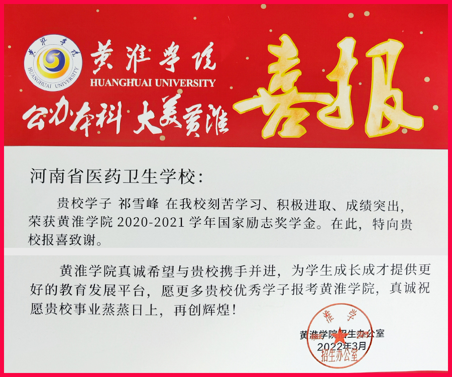 喜报▏我校毕业生获得国家励志奖学金 近日,从黄淮学院传来佳讯,我校2017级优秀毕业生祁雪峰同学荣获黄淮学院2020-2021学年国家励志奖学金。 消息传来,我校师生倍感振奋。“祁雪峰同学,在校期间思想觉悟较高...